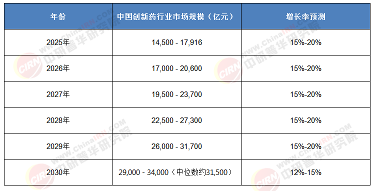 表格1:2025-2030年中國創新藥行業市場規模預測表格
