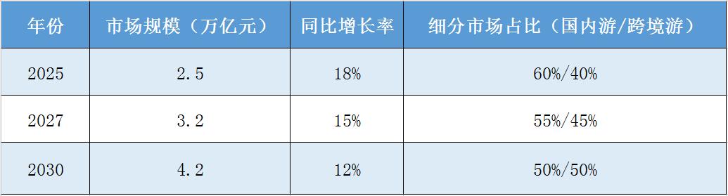中研普華《2025-2030年旅游產業深度調研及未來發展現狀趨勢預測報告》預測,2025-2030年,中國旅游產業將以年均10%以上的增速擴張,2030年市場規模或達4.2萬億元。其中,跨境旅游貢獻超半數增量,國內游則向深度體驗、高端定制方向升級。