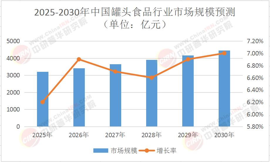 中研普華《2025-2030年中國罐頭食品行業產銷需求與投資風險分析報告》預測,2025年,中國罐頭食品行業市場規模預計突破3200億元,年復合增長率(CAGR)達6.2%。這一增長主要由三大動力驅動:
