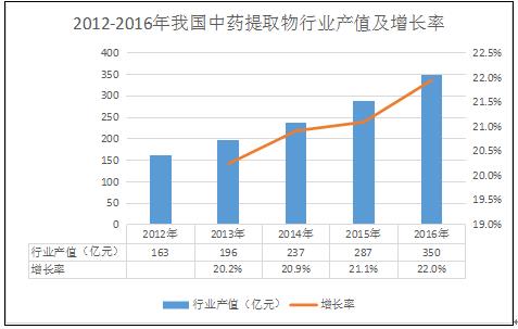 圖表:2012-2016年我國中藥提取物行業產值及增長率