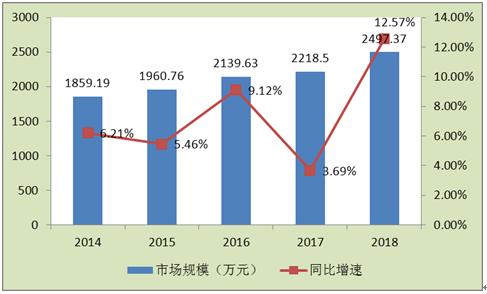 圖表:2014-2018年中國通脈口服液行業市場規模及增速