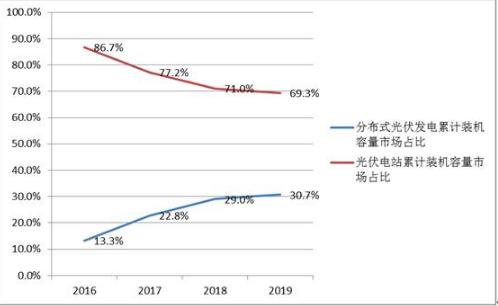圖表:2016-2019年中國光伏發電累計裝機容量市場結構情況