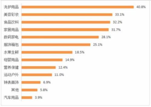 具體而言,在中國網民網購的商品類別中,洗護用品(40.8%)的比例最高,其次美容彩妝(33.1%)、食品飲料(32.2%)和家居用品(31.7%),此外依次為數碼家電、服飾箱包、水果生鮮、母嬰用品和營養保健產品。