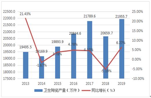 圖表:2013-2019年我國衛生陶瓷產量及增速