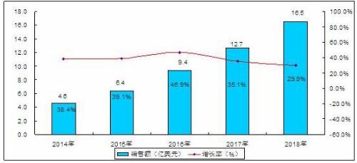 圖表:2014-2018年中國服務機器人銷售額及增長率