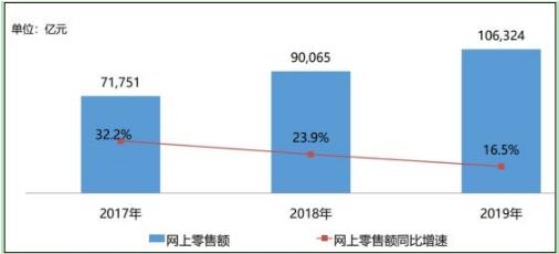 2019年,全國網上零售額達10.63萬億元,較2018年規模擴大1.63萬億元,同比增長16.5%。