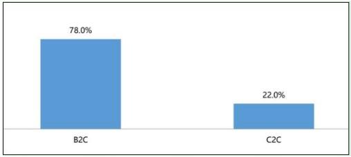 2019年,B2C網絡零售額占網絡零售總額比重達78%,同比增長22.2%,高于網絡零售整體增速5.7個百分點,高于C2C增速14.4個百分點。