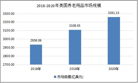 據數據顯示,2018年美國養老用品市場規模為2936.06億美元,2019年美國養老用品市場規模為3108.45億美元,2020年美國養老用品市場規模為3261.13億美元,同比增速為4.91%。