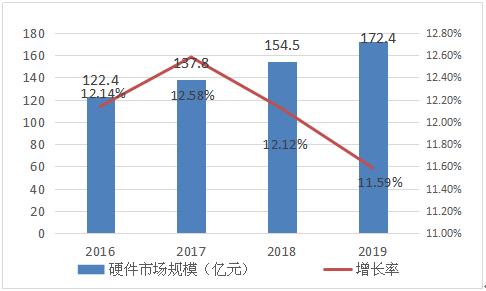 高校軟硬件應用是指在高等教育領域(教育管理、教育教學和教育科研)全面深入地運用現代信息技術來促進教育改革與發展的過程。近幾年,中國高校硬件設備市場規模持續增長,2017年市場規模達到137.8億元,增長率達12.58%,2018年市場規模擴大到154.5億元,增長率12.12%;2019年,市場規模達到172.4億元。