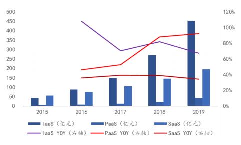 從全球細分市場來看,全球SaaS市場規模最大,IaaS次之,PaaS最小。2019年,全球SaaS云計算市場規模已達1095億美元,同比增長了18.00%,占比58.15%;IaaS市場規模為439億美元,同比增長了26.15%,占比23.31%;PaaS市場規模為349億美元,同比增長了23.76%,占比18.53%。預計全球云計算2020-2023年仍處在快速增長階段,到2023年,SaaS、IaaS、PaaS市場規模將分別達到1877億美元、971億美元、749億美元量級。與全球市場規律不同的是,我國當下IaaS市場規模最大,SaaS次之,PaaS最小。2019年,中國IaaS市場規模為452.6億元,同比增長了67.38%,2015—2019年復合增長率為181.18%;SaaS市場規模為194.8億元,同比增長了34.16%,復合增長率為137.00%;PaaS市場規模為41.9億元,同比增長了92.20%,復合增長率為168.48%。在企業對云服務認可度不斷上升的背景下,企業通過SaaS實現管理和業務全面云化的需求不斷增加。再加上2020年初新冠疫情全球范圍內的擴散傳播,國內遠程辦公、在線教育需求不斷增長,SaaS市場規模將迎來爆發式增長,云需求從IaaS向SaaS上移將是未來大勢所趨。