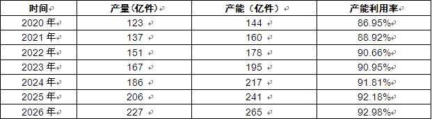 世界衛生組織高度重視針灸事業的發展,先后起草、制定、出版及推廣了若干方案和文件,其中包括“國際針灸術語標準”、“針灸臨床研究指南”、“針灸基礎培訓及安全指南”等,目前優勢病種的評估等,這些為針灸針發展奠定了基礎,未來全球針灸針發展前景良好,預計2026年全球針灸針的產量達到227億件,產能達到265億件,產能利用率達到92.98%。