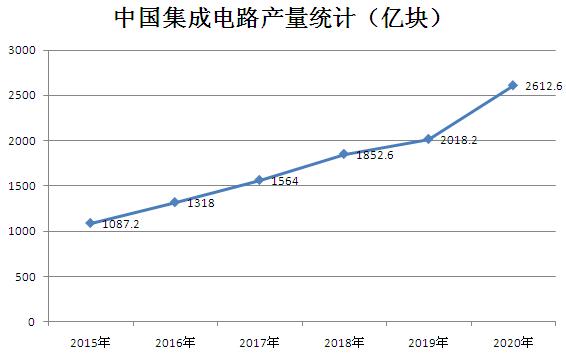 近年來,我國芯片技術不斷提升,集成電路產業快速發展。芯片是指封裝后的集成電路,是信息產業的核心之一。2020年我國集成電路維持增長趨勢,產量較2019年有所增長。數據顯示,2020年中國集成電路產量達2612.6億塊,同比增長16.2%。