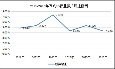 據數據顯示,預測2021年裸眼3D行業投資增速為4.84%,2026年裸眼3D行業增速為4.32%,預測2021-2026年裸眼3D行業投資增速在5%左右。