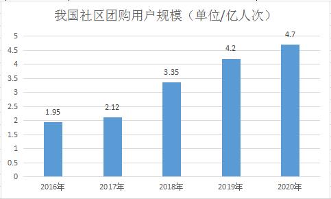 經(jīng)過了一輪飛速擴(kuò)張,我國(guó)社區(qū)團(tuán)購(gòu)的用戶規(guī)模迅速增長(zhǎng)。根據(jù)相關(guān)統(tǒng)計(jì),2016年到2020年,社區(qū)團(tuán)購(gòu)的用戶規(guī)模分別為0.95億人、2.12億人、3.35億人、4.2億人和4.7億人。