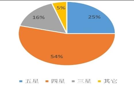 2020年湖南省掛牌五星級或按五星級標準經營的酒店(以下簡稱五星級酒店)占比25%(其中湖南省所有掛牌五星級酒店均按時參與了月度統計),四星級酒店或按四星級標準經營的酒店(以下簡稱四星級酒店)占比54%,三星級酒店或按三星級標準經營的酒店(以下簡稱三星級酒店)占比16%,其余酒店占比5%。總體來看,參與統計酒店以中高端酒店為主。