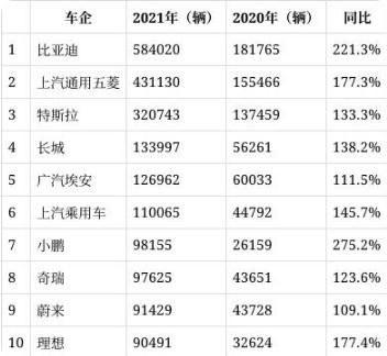 位列榜首的比亞迪汽車,2021年全年累計零售新能源汽車584,020輛,同比增長221.3%。此外,比亞迪第100萬輛新能源車在2021年5月19日正式下線,成為首個進入新能源汽車“百萬俱樂部”的中國品牌。