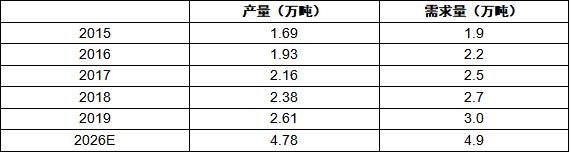 圖表:2015-2026年中國飛秒激光加工的超疏水及親疏水材料的產量、需求量情況及預測