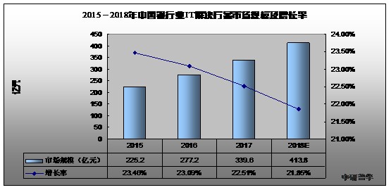 圖表:2015-2018年中國銀行業IT解決方案市場規模及增長率