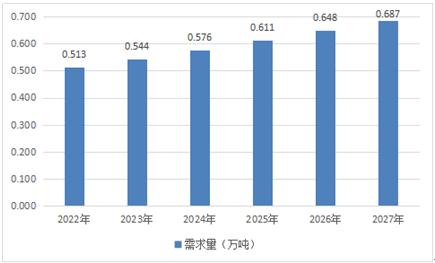 圖表:2022-2027年中國真空吸盤掛鉤行業需求規模(萬噸)