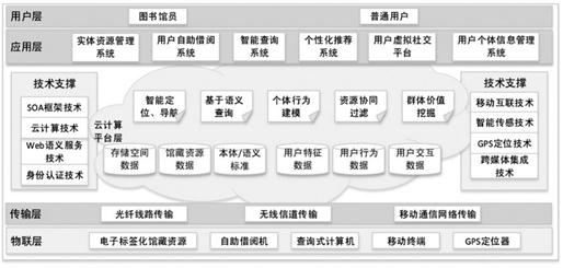 智慧圖書館由物聯層、傳輸層、云計算平臺層、應用層、用戶以及技術支撐六個部分組成。物聯層包括RFID、智能傳感、自動定位技術支持下的電子標簽化館藏資源、自助借閱機、查詢式計算機、移動終端以及GPS定位器等設備部署,用以實現館藏圖書的自動上架、智能導航。
