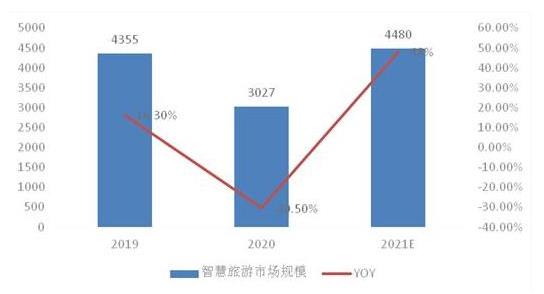 目前我國智慧旅游行業整體發展并未成熟,行業市場滲透率不高,2019年我國智慧旅游業市場規模為4355億元,2020年受疫情影響市場規模有所收縮,較2019年回落30.5%,隨著我國疫情后經濟快速復蘇以及各地旅游業重新開業預計到2021年年底我國智慧旅游業市場規模將達到4480億元,較2020年上漲48%。