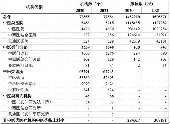 2021年,全國中醫類醫療衛生機構總數77336個,比上年增加4981個。其中:中醫類醫院5715個,中醫類門診部、診所71583個,中醫類研究機構38個。與上年比較,中醫類醫院增加233個,中醫類門診部及診所增加4753個。