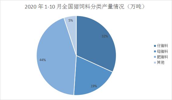 2020 年 1-10 月,全國仔豬料產量 2,158 萬噸,占比 31.81%;育肥豬料產量 2,943 萬噸,占比 43.39%;母豬料產量 1,306 萬噸,占比 19.25%,三者合計占比 近 95%。2020 年 1-10 月全國豬飼料分類產量情況如下圖所示: