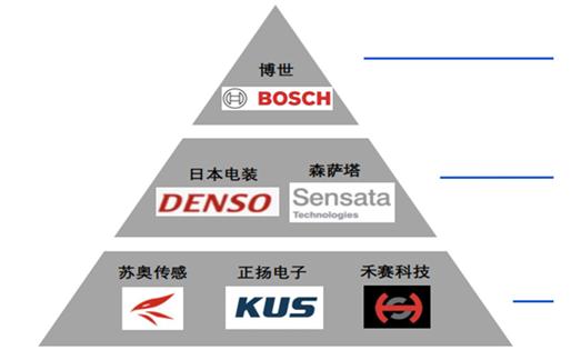 當前,我國汽車傳感器行業競爭格局呈“正三角”形式,第一梯隊是國外廠商博世(BOSCH)、第二梯隊是日本電裝(DENSO)和森薩塔(Sensata)、國內廠商蘇奧傳感、正揚電子與禾賽科技處于第三梯隊。