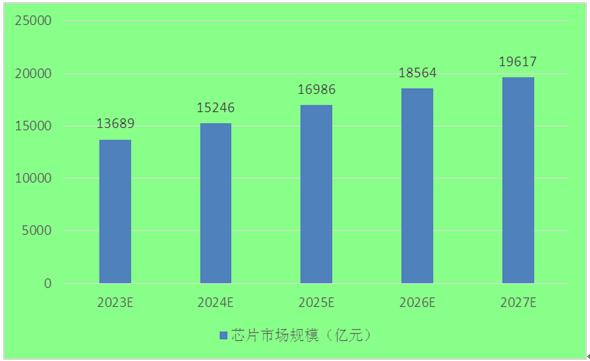 目前芯片市場規模預計在未來的5年內,芯片的市場規模會在2027年達到19617億元,增速逐步下降。