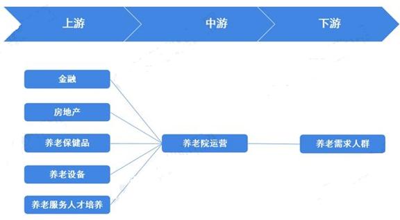 從產(chǎn)業(yè)鏈條來看,養(yǎng)老院行業(yè)是基于醫(yī)療行業(yè)和政府公共服務(wù)建立起來的。在產(chǎn)業(yè)鏈上游主要有金融、房地產(chǎn)、養(yǎng)老保健品、養(yǎng)老設(shè)備、養(yǎng)老服務(wù)人才培養(yǎng)等環(huán)節(jié)。養(yǎng)老院的中游是養(yǎng)老院運營,下游則是養(yǎng)老需求人群。