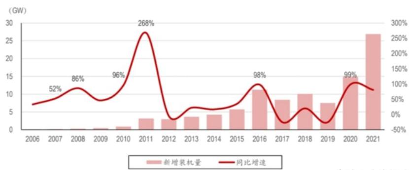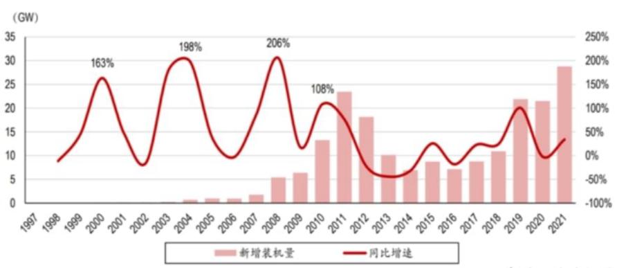 圖表:1997-2021年歐洲新增裝機量與同比增速