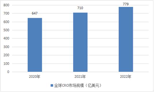 圖表:2020-2022年全球CRO市場規模(億美元)