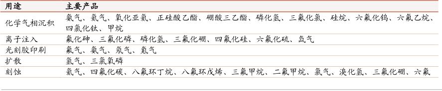 電子氣體種類繁多,按照用途劃分為電子特種氣體和電子大宗氣體兩類。電子大宗氣體一般用作電子工業生產的環境保護氣、載氣等,常用于高溫熱退火、保護氣體、清洗氣體等環節。電子特種氣體普遍應用于半導體芯片、液晶面板材料制造等各個工藝流程中,比如清洗、沉積、光刻、刻蝕、離子注入、成膜、摻雜等環節。截至2020年,僅特種氣體中的單一組分氣(不包含混合氣)已有260種,具有相近化學組成的同系物通常具有相似化學性質:例如氟化物(六氟乙烷、三氟化碳)都具有腐蝕性,常用作半導體刻蝕氣;硅烷與乙硅烷都可用作氣相沉積成膜工藝。
