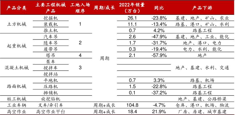 工程機械的品類眾多,其中挖掘機市場規模最大且施工順序靠前,居于核心地位。我國工程機械種類繁多,擁有20大類、109組450種機型、1090個系列、上萬個型號的產品設備。傳統的工程機械產品周期屬性較強,包括土方機械、起重機械和混凝土機械,從2022年工程機械協會披露的銷量數據來看,挖掘機銷量26.1萬臺,市場規模最大,主要應用在基建、地產、市政工程與農田水利等領域,應用場景最為廣泛;起重機械應用在設備吊裝、原材料跨區域、跨高度搬運、預制件吊裝等,近年來應用場景逐漸增多;混凝土機械應用在混凝土澆筑,主要應用場景有地產和基建等。而叉車、高空作業平臺的下游領域分散,除周期屬性之外,也具備一定的成長屬性。