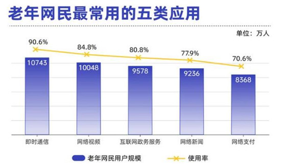 調(diào)查數(shù)據(jù)顯示,老年網(wǎng)民主要使用手機(jī)上網(wǎng)。即時(shí)通信、網(wǎng)絡(luò)視頻、互聯(lián)網(wǎng)政務(wù)服務(wù)、網(wǎng)絡(luò)新聞、網(wǎng)絡(luò)支付是老年網(wǎng)民最常用的五類(lèi)應(yīng)用,其中,老年網(wǎng)民對(duì)網(wǎng)絡(luò)新聞的使用率較網(wǎng)民整體高 3.2 個(gè)百分點(diǎn),是唯一一個(gè)老年網(wǎng)民使用更多的應(yīng)用類(lèi)型,體現(xiàn)出老年網(wǎng)民關(guān)心時(shí)事、追熱點(diǎn)的特點(diǎn)。