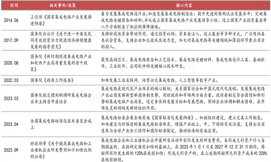 回顧國內半導體行業歷史政策,從國家到地方先后出臺多項扶持政策,推進半導體產業的發展。從方向上看,現有扶持政策聚焦高端芯片、集成電路裝備和工藝技術、集成電路關鍵材料、集成電路設計工具、先進存儲、先進計算、先進制造、高端封裝測試、關鍵裝備材料、新一代半導體技術等關鍵“卡脖子”領域;從方式上看扶持政策深入財稅、融資、平臺、對外開放、進出口政策、產業園區建設、產業鏈孵化器、國產替代等諸多細化抓手,為半導體產業的高質量發展提供了可實際操作的行動指南。