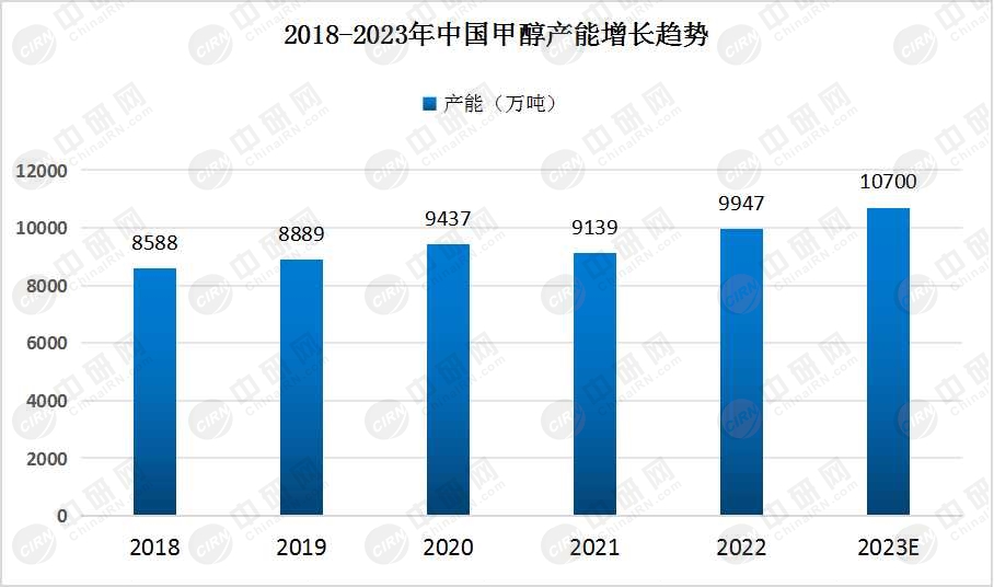 據中研普華研究院撰寫的《2024-2029年中國甲醇行業市場分析及發展前景預測報告》數據顯示,2022年我國甲醇總產能達到9947萬噸,同比增長8.84%,其中,規模在50萬噸/年及以上的產能占比超七成。分析師預測,2023年產能約為10700萬噸。