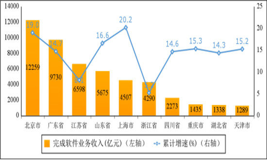 主要軟件大省收入占比小幅提升。上半年,軟件業務收入居前5名的省份中,北京市,廣東省,江蘇省,山東省,上海市軟件收入分別為12259億元、9730億元、6598億元、5675億元和4507億元,分別增長19%、14.7%、8.1%、16.6%和20.2%,五省(市)合計軟件業務收入38769億元,占全國比重為70.3%,占比較去年同期提升0.9個百分點。