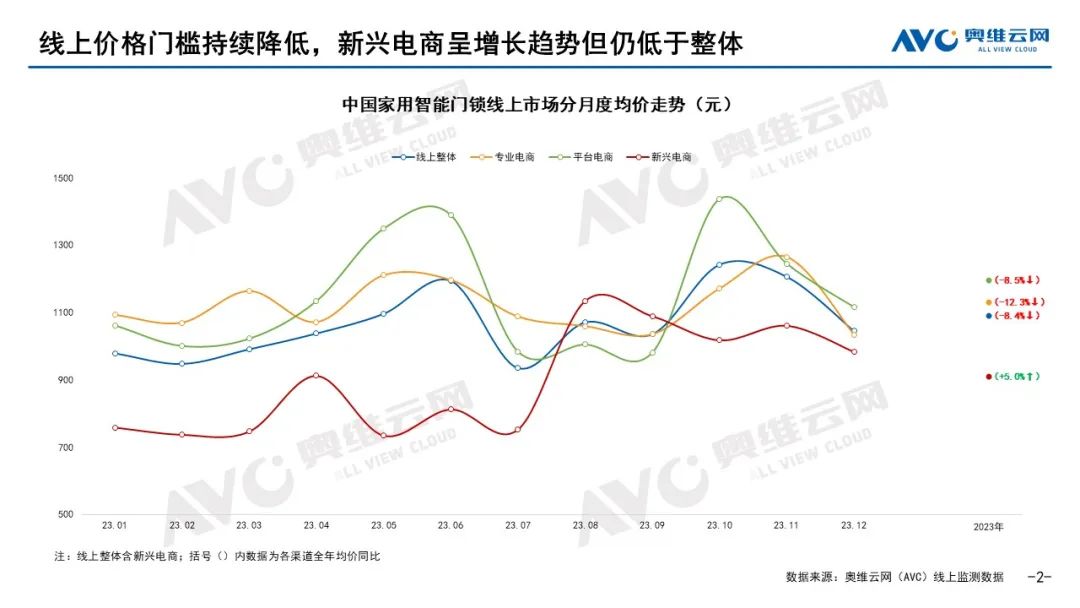 據奧維云網(AVC)線上監測數據顯示,2023年,中國家用智能門鎖行業線上市場整體均價為1092元,同比下降8.4%;新興渠道均價雖呈現增長趨勢,但全年均價為912元,處于千元以下。對行業而言,一方面,價格競爭激烈,將對智能門鎖全產業鏈的盈利帶來挑戰。另一方面,產品價格下探,也將刺激銷量增加,進一步提升智能門鎖的市場普及率。價格只是消費者考量的一個因素,從長期發展來看,更高的產品質量、安全性以及更好的售后服務才是關鍵。