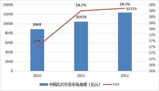 據(jù)中國半導(dǎo)體協(xié)會數(shù)據(jù),2020-2022年,中國芯片市場持續(xù)快速增長,2022年,中國芯片市場銷售額為12370億元,同比增長18.3%。