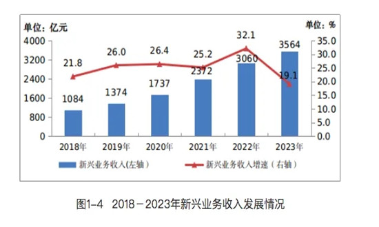 數據中心、云計算、大數據、物聯網等新興業務快速發展,2023年共完成業務收入3564億元,比上年增長19.1%。云計算、大數據業務收入比上年均增長37.5%,物聯網業務收入比上年增長20.3%,增勢明顯。