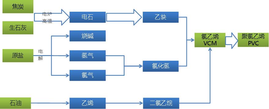 PVC的生產主要有兩種制備工藝,一是電石法,主要生產原料是電石、煤炭和原鹽;二是乙烯法,主要原料是石油。