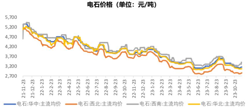 電石市場不景氣,成本端支撐持續走弱。電石市場供需結構失衡,導致價格一路下行。電石市場從2021年十月份開始調整,重心震蕩回落。由于電石市場供需關系頻繁轉換,從價格走勢可以看出呈現漲跌交互態勢。2022年底電石市場價格逐步跌破4000元/噸,進入2023年電石市場走勢依舊低迷,呈現沖高回落形態。一月中上旬,電石市場經歷短暫上漲,主要是受到下游PVC市場好轉的提振,剛需支撐增加。但從1月下旬開始,電石價格快速下行。電石生產企業開工恢復至高位后維穩運行,電石產量處于高位,市場貨源充裕。而PVC行情不佳,自身成本及虧損壓力下向上形成負反饋,打壓電石走勢。盡管PVC市場存在新增產能,但對電石整體消耗未有明顯增加。大部分時間下游PVC企業待卸車數量偏高,通過下調采購價格控制到貨量。隨著電石價格不斷回落,電石企業面臨成本及出貨壓力凸顯,降負荷或停車現象,會帶動市場出現階段性好轉。但電石市場價格上漲難以持續,整體運行區間下移。電石市場調整行情持續到6月份,多區域價格跌破3000元/噸,不斷刷新年內低點。下半年,電石行情略好轉,重心先漲后跌,主要受到PVC行情走勢的影響。