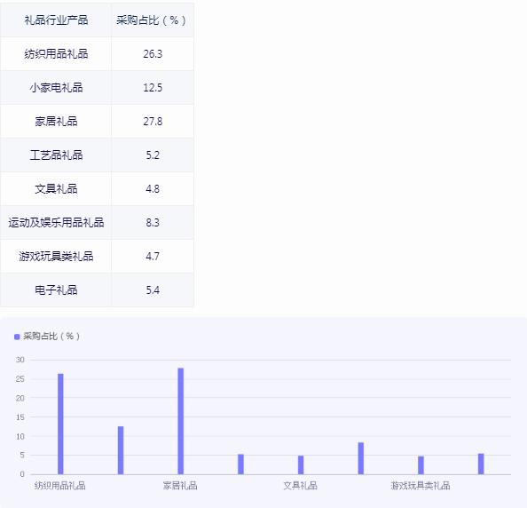 目前中國禮品行業(yè)產(chǎn)品主要包括紡織用品禮品、小家電禮品、家居禮品、工藝品禮品、文具禮品、運(yùn)動及娛樂用品禮品、游戲玩具類禮品、電子禮品等,據(jù)統(tǒng)計(jì),家居禮品類產(chǎn)品采購占比高達(dá)27.8%,其次為紡織用品和小家電禮品,采購占比分別為26.3%和12.5%。