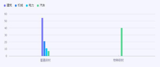 因為用途的不同,鋼材也可分為普通鋼材和特種鋼材,其中普通鋼材的下游需求主要集中在建筑、機械、電力及汽車等領域,其中建筑領域占比超過一半,高達54.3%,機械領域為21%,電力領域為10.9%,汽車領域為 7%。而特種鋼材因為其物理性和化學性都優于普通鋼材,所以特種鋼材的下游需求主要集中在汽車、工業制造、金屬制品及發電等高端制造業。其中汽車需求占比達到了40%。