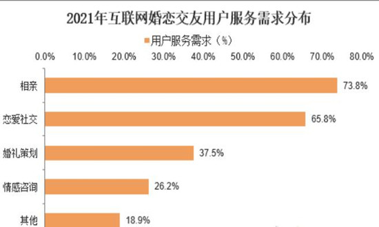 我國互聯網婚戀交友本質上是相親服務,相親是用戶最主要的服務需求,用戶需求高達73.8%,此外,以婚戀為切入點,互聯網婚戀交友同時滿足了用戶戀愛社交的互動需求。
