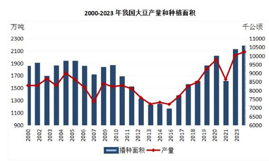 2023年,國(guó)家出臺(tái)穩(wěn)定大豆生產(chǎn)一攬子支持政策,提高大豆生產(chǎn)者補(bǔ)貼,加大金融信貸支持,推廣大豆玉米(2388, -14.00, -0.58%)帶狀復(fù)合種植,引導(dǎo)新型農(nóng)業(yè)經(jīng)營(yíng)主體種植大豆,穩(wěn)定大豆種植規(guī)模。受政策支撐,加之本年度年國(guó)產(chǎn)大豆播種及生長(zhǎng)期天氣整體理想,2023年我國(guó)大豆播種面積、單產(chǎn)、產(chǎn)量均實(shí)現(xiàn)同比增長(zhǎng)。根據(jù)國(guó)家統(tǒng)計(jì)局?jǐn)?shù)據(jù),2023年國(guó)內(nèi)大豆產(chǎn)量416.8億斤,比上年增加11.2億斤,增長(zhǎng)2.8%;大豆單產(chǎn)132.7公斤/畝,每畝產(chǎn)量比上年增加0.7公斤,增長(zhǎng)0.5%;大豆播種面積1.57億畝,比上年增加345.1萬畝,增長(zhǎng)2.2%,連續(xù)兩年穩(wěn)定在1.5億畝以上。