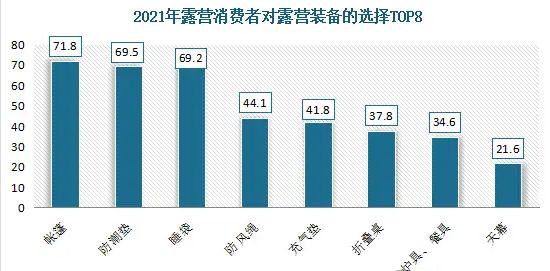 裝備方面,帳篷是消費者首先裝備。有相關數據顯示,2021年超過70%的消費者購買了帳篷,具體占比達到71.8。其次為防潮墊、睡袋,分別占比69.5%、69.2%。