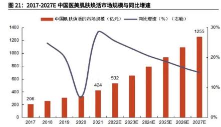 膠原蛋白在醫美領域的應用特色:1)提供皮膚營養。由于皮膚有 85%為 I 型膠 原蛋白,直接注射有助于皮膚獲取充足營養物質;2)淡化黑色素。膠原蛋白的 降解產物可以抑制酪氨酸酶的活性,從而降低黑色素生成;3)達到支撐效果的 同時,產生較好的抗衰性。注射膠原蛋白后,可達到固定與支撐皮膚組織的效果, 施打部位不易移位,另外可誘導纖維母細胞再生,幫助人體生成新的膠原蛋白。 據弗若斯特沙利文,2017-2021 年,中國的醫美肌膚煥活應用市場的市場規模從 206 億元增長至 424 億元,CAGR 為 19.7%。預計未來仍然會保持較高的增速, 2022-2027 年,市場規模有望從 532 億元增長至 1255 億元,CAGR 為 18.7%。