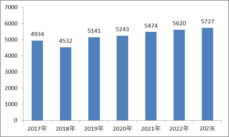 就占比最高電力電纜產量變動情況而言,根據數據顯示,在經歷2017-2018年連續兩年產量規模下滑之后,2019年,我國電力電纜總產量規模有所回升,整體規模達到5141萬千米,同比2018年增長13.44%。2020年,受公共衛生事件影響,我國電線電纜行業增速有所放緩,整體規模達到5243萬千米,同比2019年增長1.98%。2022年我國電力電纜產量為5620萬千米,較2021年增長146萬千米。預計2023年我國電力電纜產量為5727萬千米。
